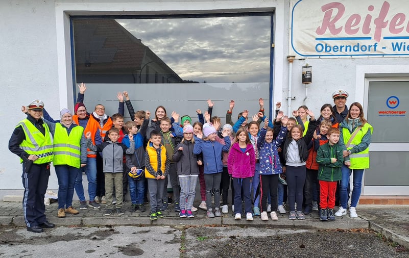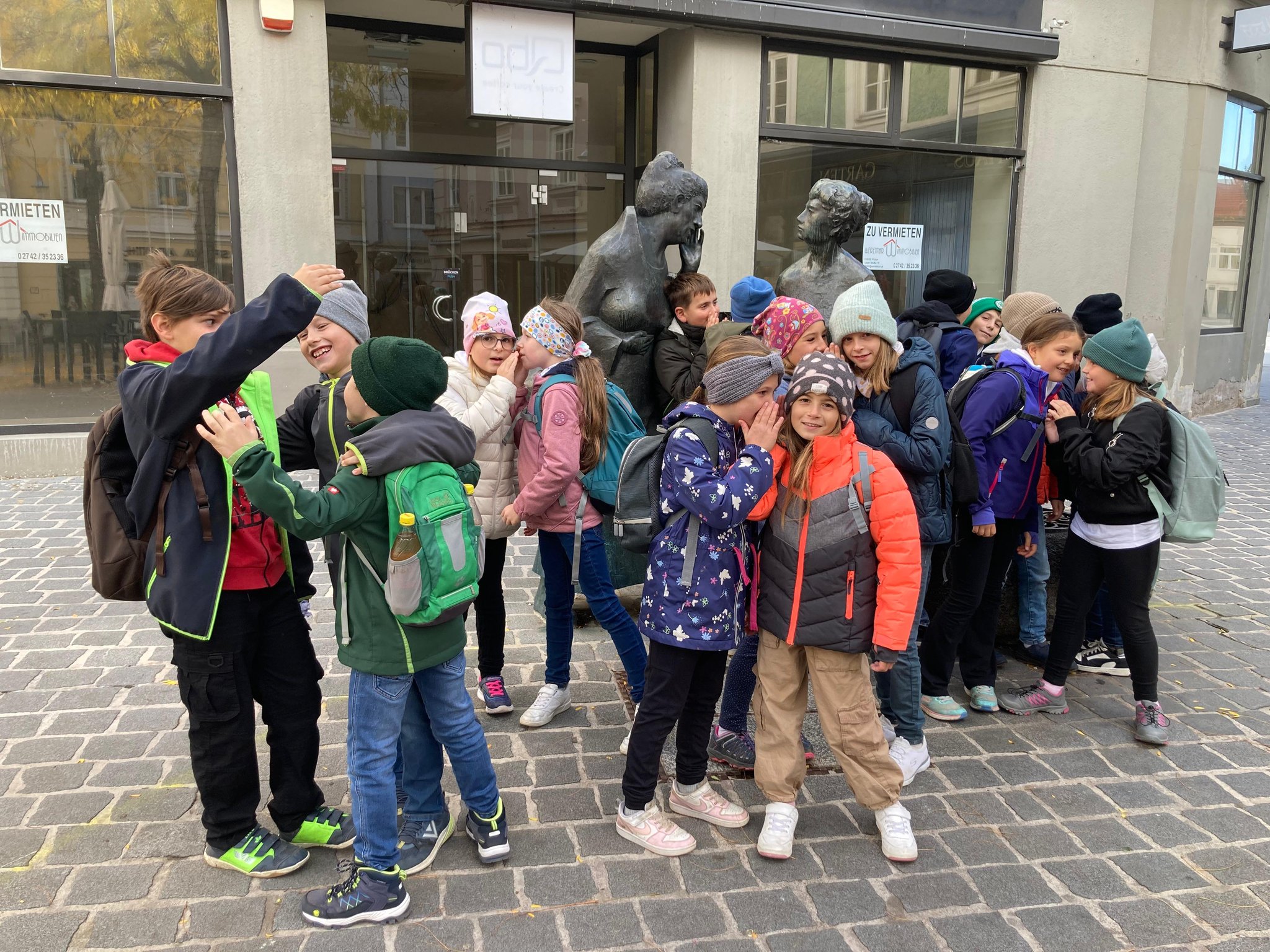 Eine Herbstwanderung führte die Kinder der 2a und 2b zum Straußenhof Halmer. Da durfte das Fotoshooting beim Fliegerplatz mit einer prächtigen Aussicht auf Oberndorf nicht fehlen!, Die Kinder erhielten wertvolle Informationen über das Leben und die Haltung von Sträußen.