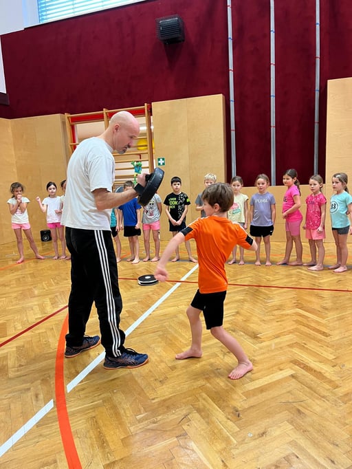 Die Stunde mit HOPSI HOPPER war wieder extrem lustbetont und die Kinder durften dabei eine neue Sportart erfahren: Kickboxen, das auf Kraft und Reaktion abzielt. Hierbei waren die Koordinationsleiter und das Durchklettern und Rollen angesagte Übungen.